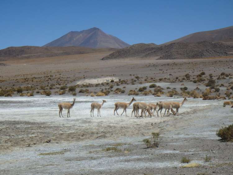 Nous reprenons la route tôt le matin pour rejoindre le Sud. On s’arrête à plusieurs endroits en chemin : vestiges d’un ancien cimetière, spots avec paysages rocheux ou avec panorama sur les montages, lagune où se rassemblent des centaines de flamands roses et quelques vigognes. On finit par le plus beau spot de la journée, la lagune rouge, qui tient sa couleur des algues présentent dans son eau.