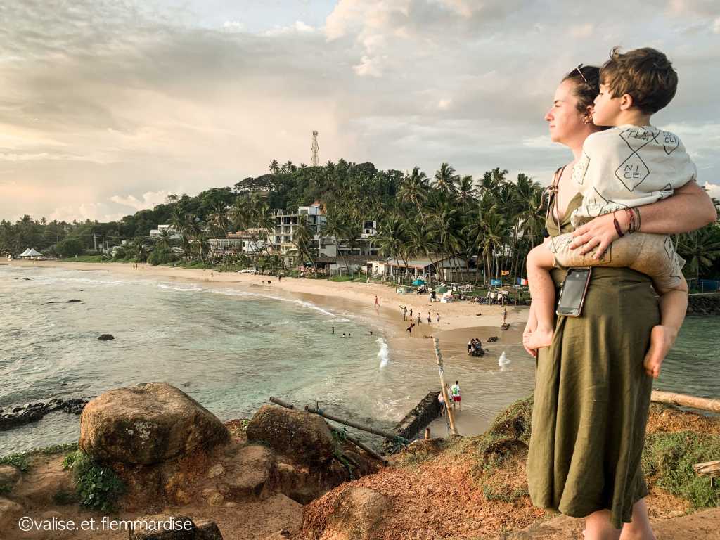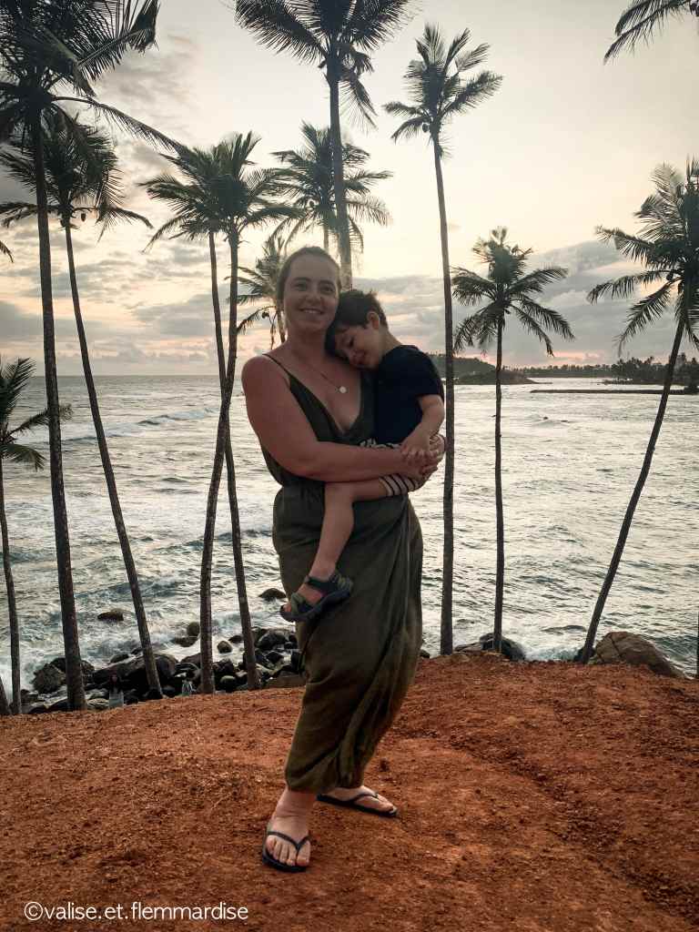 Ce qu’on peut te dire si tu pars en Avril dans le Sud du Sri Lanka, c’est que tu risques d’avoir principalement du beau temps avec potentiellement quelques gouttes, mais tu es encore dans la bonne saison ! Cependant, l’océan commence à s’agiter et il est plus difficile de trouver une plage calme, ce qui peut être compliqué avec enfants. Alors que les plages de l’Est sont censées être calmes à cette période de l’année. Ça ne nous a pas empêché de profiter avec Léo et on a pris des hôtels avec piscine donc l’inconvénient était plutôt limité comparé au détour qu’un itinéraire dans l’Est nous aurait imposé…
